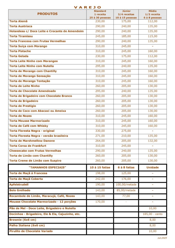 – Júnior – “jr” – (3/4 de uma receita) com diâmetro de 21 cm, servindo 10 fatias comerciais ou de 12 à 15 fatias para particulares;